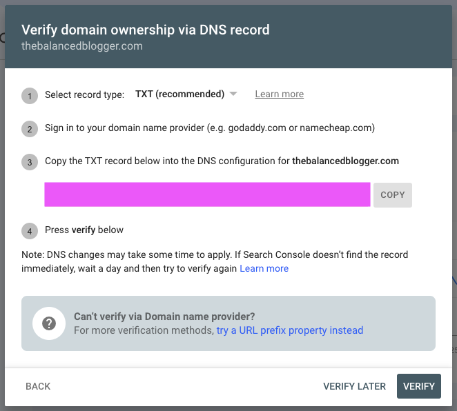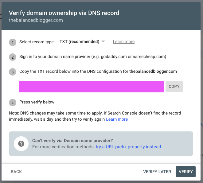 Google will then give you some instructions to connect your website to the Search Console. Keep the drop down option record type as ‘TXT (recommended) and copy the TXT record that Google gives you in box 3.