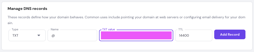 Paste the information you copied from Google Search Console into the ‘TXT value’ box and click ‘Add Record.’