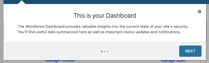 The Wordfence plugin will then walk you through 3 screens. This is to help you familiarise you with the Wordfence Plugin Dashboard within WordPress.