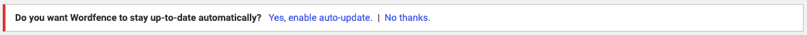 On the Dashboard, you’ll likely notice the following warning asking whether or not you want to up-date Wordfence automatically.