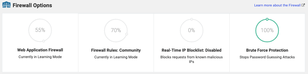 You’ll see that the Brute Force Protection is now working. The other three sections will be in ‘Learning Mode.’ This is because Wordfence is trawling your site to understand how it works and quietly sets itself up in the background. Wordfence will continue to learn about your website for around a week.