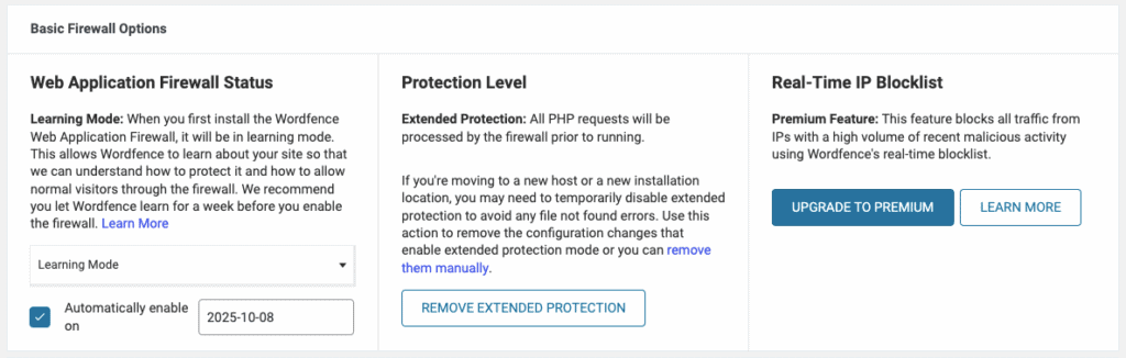 Underneath this, you’ll see ‘Basic Firewall Options.’ You’ll see that Learning Mode is highlighted in the drop down menu and that after a week, Wordfence will automatically change this to ‘Enable and Protecting.’