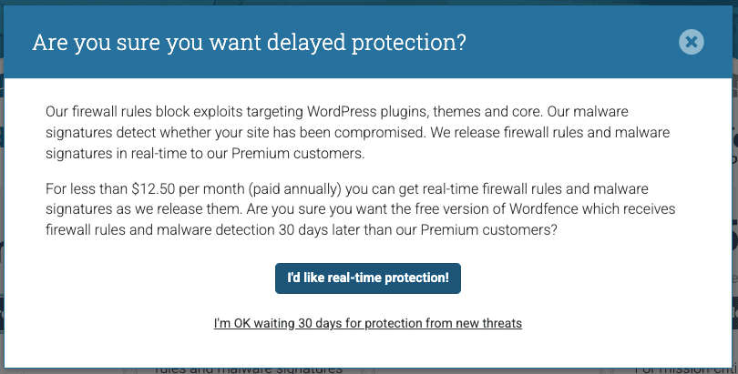 As you’ve clicked ‘Get a Free License,’ Wordfence will invariably try and upsell you on your website’s protection.